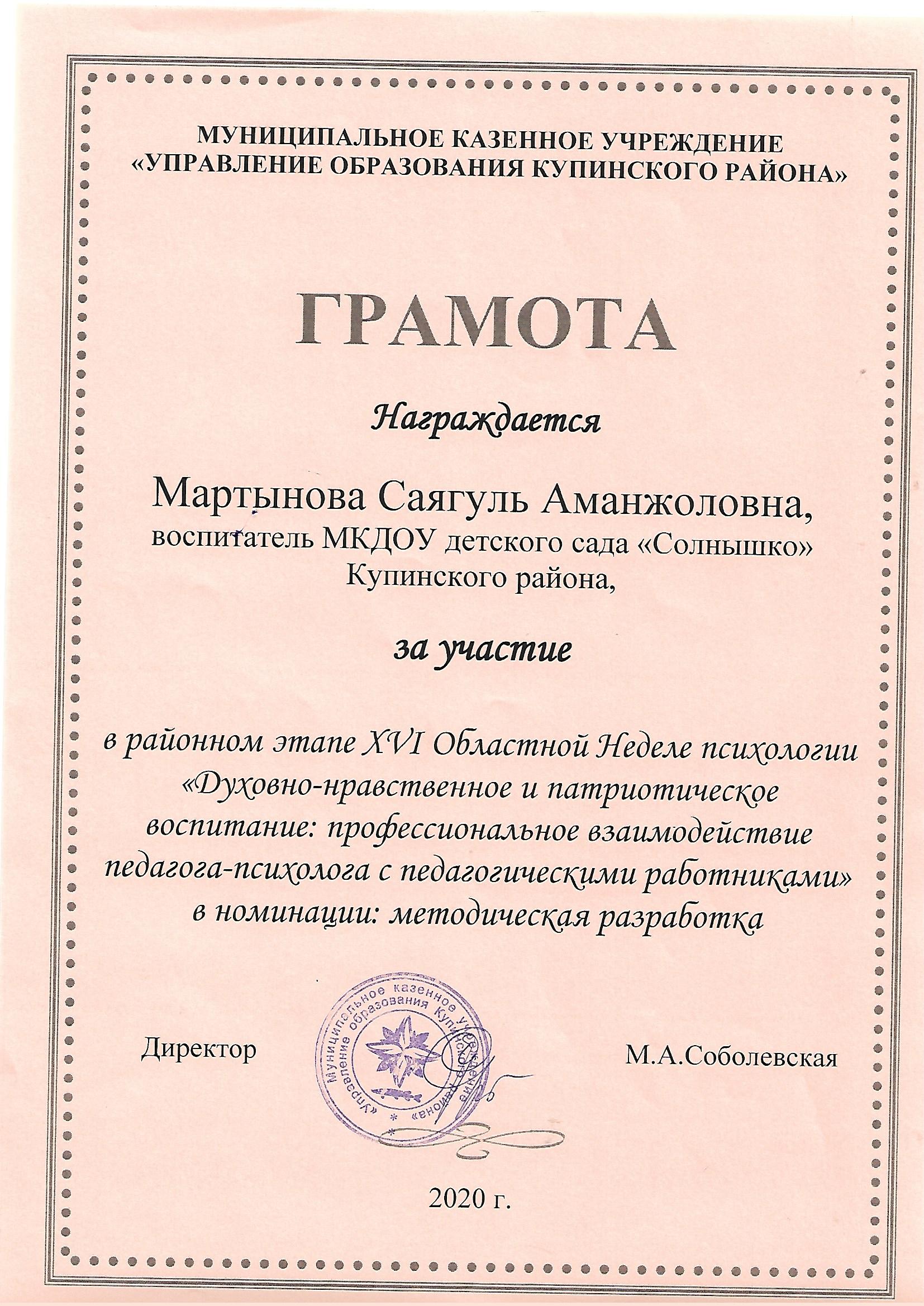 2020 Грамота за участие в районном этапе XVI Областной Неделе психологии «Духовно-нравственное и патриотическое воспитание: профессиональное взаимодействие педагога-психолога с педагогическими работниками» в номинации: методическая разработка