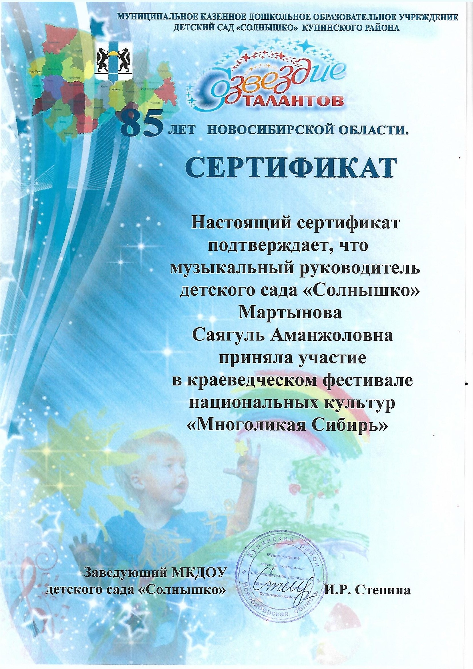 2022 Сертификат участия в краеведческом фестивале национальных культур "Многоликая Сибирь"