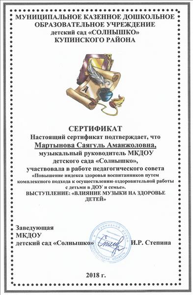 2018 Сертификат участника педагогического совета "Повышение индекса здоровья воспитанников путем комплексного подхода к осуществлению оздоровительной работы с детьми в ДОУ и семье" Выступление: "Влияние музыки на здоровье детей"